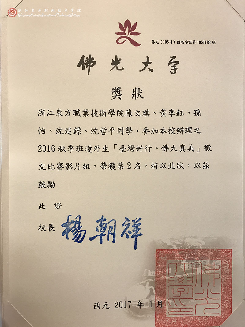 1月6日下午,台湾佛光大学怀恩馆内,2016级秋季班境外交流师生欢聚一堂,隆重举行结业典礼。来自我院财经学院的交流生陈文琪、黄李钰以及财务专班的孙怡、沈建镖、沈哲平五位同学提交的《遇见佛光》视频作品,在数十件参赛作品中脱颖而出,荣获佛光大学 “台湾好行,佛大真美” 征文比赛影片组第二名的殊荣。