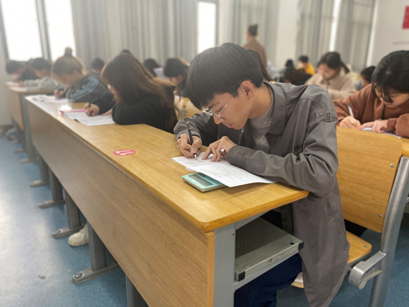 临近结束同学们还在奋笔疾书,时不时抬头看一下讲台上的时钟,随后低下头继续答题。希望尽自己所能,力求能给一个完美的答案。努力避免任何一个疏忽,这也体现了同学们对财会职业严谨仔细的态度。