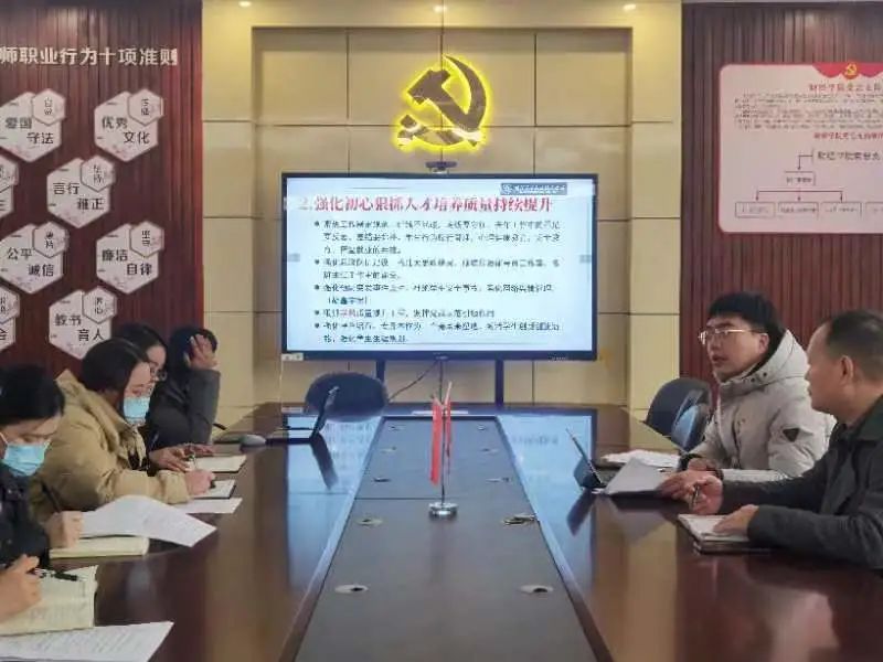 会议伊始,缪枫,书记传达了学校2023年度新学期工作会议精神,集体学习了相关会议要求,就辅导员的相关思考、工作计划进行交流、指导。他然后指出要守住初心、狠抓培养质量,形成工作规范,持续产出优秀人才。对基本工作做到“红线不能碰,底线要守住”,将格局打开,加强各类工作室建设。同时通过具体案例,生动表明如何应对突发状况。最后,重点点出要狠抓学风质量,强化特色培育,完善学生生涯规划。